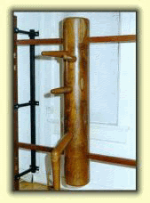 Materials Teak was often traditionally used for all parts of the dummy. But, since solid blocks of this exotic hardwood are increasingly hard to find, you can use almost any strong hardwood - one that’s heavy, strong and dense, but not brittle. Some softwoods may not have enough strength to withstand the force applied to a dummy, or have the proper weight. Another problem with softer wood is that over time, as the arms and legs are struck repeatedly, they become compressed and more "sloppy" in their movement. Because it’s difficult to get hardwood in a piece large enough, you might try laminated wood (although the look will be different with all those lines running through it). Avoid wood with pitch in it, and the wood should be well seasoned - dry all the way through - to avoid cracking. Try to find wood native to your area since transporting it from a different climate, especially with different humidity, can cause cracking. Even with these precautions wood will still sometimes check or split, in which case you might use a wood fill or banding. Body Use hardwood for the body so its weight will correspond to that of a human body. This way if you can move the dummy you can also move a person. The body has a round cross section of about nine inches in diameter. Anything smaller doesn’t give the needed weight and requires adjustments in the length of arms and leg. The height of the body is five feet. Make the cross section as close to a perfect circle as possible. Irregularities in the surface could cause damage to hand, fist or foot. The body should be smooth, though not necessarily polished, to avoid splinters. Slightly taper or round off the top and bottom of the body to remove hard edges. One of the hardest parts of dummy construction is cutting the square holes for the arms. First drill circular holes, then square them with hand chisels. In order to give both arms room to pass through the dummy, the left arm (facing the dummy) is slightly higher than the right. The holes intersect at their outer edges where they cross in the exact center of the dummy. An advantage of hardwood is that you’re less likely to tear up the center of the dummy as you cut these overlapping holes. Arms The arms should be the same material as the body, since they need as much strength. Stress on the arms is at the point where they enter the body. Turn the arms on a lathe, rather than make them by hand, since a smooth level surface is essential. All three arms are identical Each is twenty-two inches long, divided into two sections: one eleven inch half goes through the dummy body and out the back, the other eleven inch half sticks out from in front of the dummy. All three arms are set parallel to the floor. The visible half of the arm, extending from the dummy, is cylindrical - though wider at the point where it leaves the body and tapering smaller towards the tip. The widest part, closest to the dummy, is two and a half inches in diameter. The amount of taper differs, but a loss of about an inch, down to one and a half inches in diameter at the tip, is average. Slightly round off the tip end so there are no hard edges. The inner hidden half of the dummy arm has a square cross section. Though it’s far easier to make the inner half cylindrical, this would allow the dummy arm to spin on contact - unlike a real opponent’s arm. This half of the arm can be either in line with the outer half, or offset from center so one corner of the inner half touches one edge of the outer half while the opposite corner of the squared inner half is inset from the edge of the rounded outer half. While this offset is more difficult to make, it allows the dummy arms to be adjusted to different angles simply by switching or turning the arms, causing the width apart at the tapered ends to be changed. While the distance apart at the tips depends on your own body - the upper arms point at your shoulders when you stand at an arms length away from the dummy - the average is about eight and a half inches. The upper arm is nine inches down from the top of the dummy. The lower arm is eight and a half inches down from the upper arms, extending straight out from the center of the body. The holes cut in the body for the arms should provide a fairly tight fit, neither too tight or too loose. Your technique on the dummy can be judged by the sound of the arms moving in their holes: a dull thud indicates tension in the arms, caused by holding back power, while a sharp "clack" shows power has been properly passed to the dummy without force being reabsorbed into your own arm. Extend the dummy arms through the body and out the back two inches. Secure the arm in place with a removable pin or wedge. Leg The leg is divided into two sections: one half extending through the dummy and out from the front center of the body to a "knee joint", the other half extending down towards the "ankle." The leg is the least standardized part of the dummy. The upper part of the leg may come straight out from the dummy, parallel with the floor, or it may extend downwards at an angle. The lower part of the leg may come straight down, at a right angle to the floor, or it may extend forward at an angle. It is meant to correspond to your own leg, if you were to stand with one leg forward, so keep this pattern in mind when making your wooden leg. Use the knee joint as your guide and have it roughly at the same height as your own knee. The upper section of the leg is twenty-two inches long: one half of which extends through the dummy and out the back, the other half extending out in front. The part that passes through the dummy must be smaller than the part that is visible, so the leg won’t slide back up into the dummy. The lower "hanging" section is about thirteen inches long. As with the arms, the leg is secured in back with a removable pin or wedge. The diameter of the leg is not standardized, since it was traditionally made from a hardwood branch with a knot and 