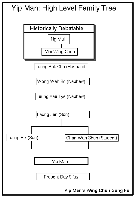 After her marriage Wing Chun taught Kung Fu to her husband Leung Bok Chau. He in turn passed these techniques on to Leung Lan Kwai. Leung Lan Kwai then passed them on to Wong Wah Bo. Wong Wah Bo was a member of an opera troupe on board a junk, known to Chinese as the Red Junk. Wong worked on the Red Junk with Leung Yee Tei. It so happened that Abbot Chi Shin, who fled from Siu Lam, had disguised himself as a cook and was then working on the Red Junk. Chi Shin taught the Six-and-a-half-point Long Pole techniques to Leung Yee Tei. Wong Wah Bo was close to Leung Yee Tei, and they shared what they knew about Kung Fu. Together they shared and improved their techniques, and thus the Six-and-a-half-point Long Pole was incorporated into Wing Chun Kung Fu. Leung Yee Tei passed his Kung Fu on to Leung Jan, a well known herbal Doctor in Fat Shan. Leung Jan grasped the innermost secrets of Wing Chun, attaining the highest level of proficiency. Many Kung Fu masters came to challenge him, but all were defeated. Leung Jan became very famous. Later he passed his Kung Fu on to Chan Wah Shan, who took me and my elder Kung Fu brothers, such as Ng Siu Lo, Ng Chung So, Chan Yu Min and Lui Yu Jai, as his students many decades ago.